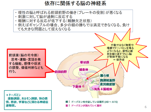厚生労働省資料「ギャンブル依存症の理解と相談支援の視点」によると、ギャンブル依存症はドーパミンと呼ばれる物質が対する反応低下で引き起こされます。
