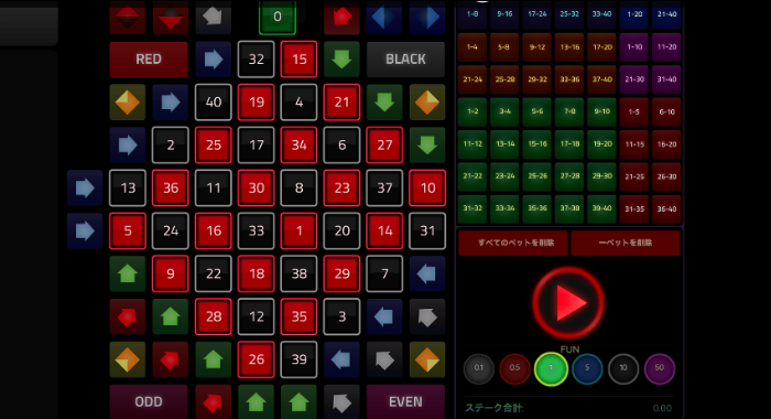 そのため、赤黒や奇数・偶数、ストレートアップ(一点賭け)以外は通常と全く異なる賭け方が可能です。一風変わったルーレットを楽しみたい方はプレイしてみましょう。