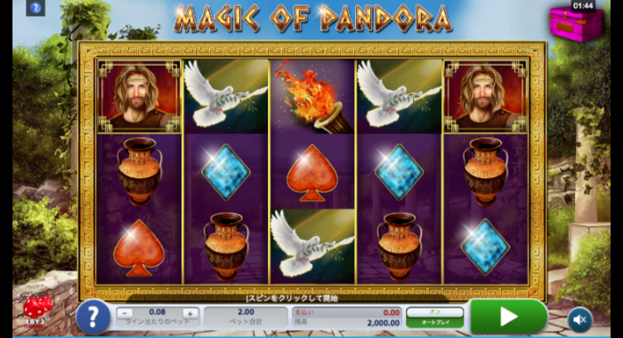 「Magic of Pandora」はギリシャ神話に登場するパンドラと彼女が開けてしまった箱を題材としたスロットです。通常ゲーム中にランダムで箱が出現し、中身によって3×1や1×1リールのワイルドが複数出現するといった演出が取り入れられています。