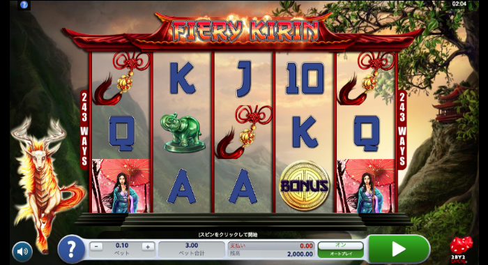 「Fiery Kirin」は伝説の生物である麒麟をモチーフにしたスロットで、243通りのペイラインを持つメガウェイズ機種です。3リール目にワイルドが出現すると2~4リール目が4列に拡大しペイラインが576通りに増加します。