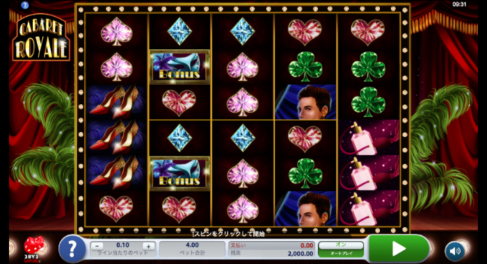 「Cabaret Royale」はキャバレーを題材としているスロットです。このゲームはリールの形状が珍しく、全体は6×5リールの形式になっていますが、2~4リール目にかけては上下で3列ごとに分かれています。