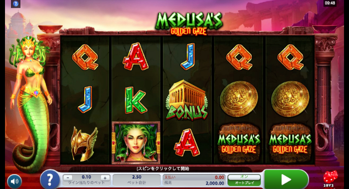「Medusas Golden Gaze」はギリシャ神話に登場するメドゥーサがモチーフで、1リール目がすべて同じ図柄だった場合に石化能力を使って2~5リール目をランダムで同じ図柄に変化させてくれます。