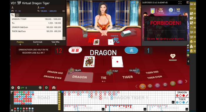 「Virtual Dragon Tiger」は実際のディーラーは存在せず、3Dで描かれた架空のディーラーがゲームの進行を行うバーチャルシリーズの1つです。対戦するゲームの内容はバカラによく似ているドラゴンタイガーで、ライブカジノと同じように他のプレイヤーと同時にプレイします。