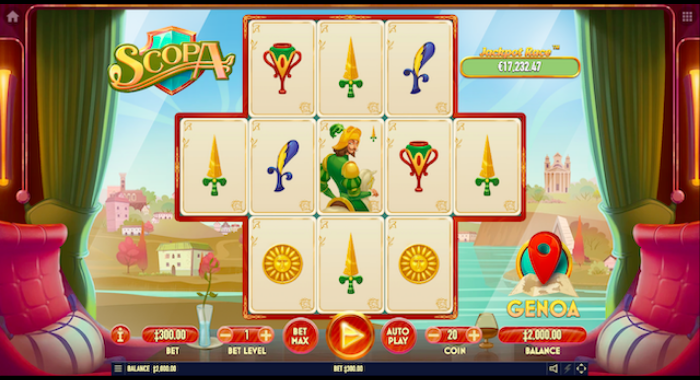 「SCOPA」は、イタリアで人気のカードゲーム「スコパ」を楽しみながら、列車でイタリア各地を旅するテーマとなっています。右から左へ回転する珍しいゲームで、フリースピンごとに次の町が解除されるため車窓から見える風景が変わっていくのが魅力です。