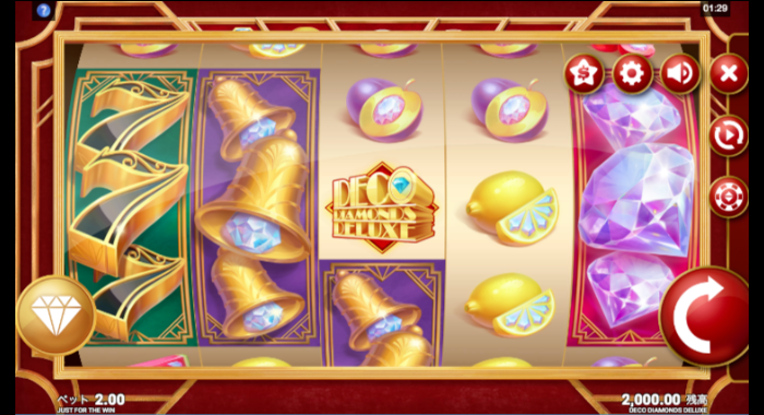 「Deco Diamonds Deluxe」はフリースピンはありませんが、ジャックポットが当たるボーナスゲームとワイルド図柄が大きな鍵となっています。
