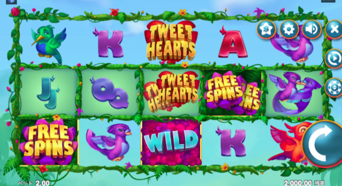 「Tweethearts」は各リールの2列目が特殊な仕様になっていて、スキャッターやワイルドといった図柄が2つ分出現します。そのため、フリースピンが揃いやすかったり、配当が多くもらえるなどの恩恵がある点が特徴です。