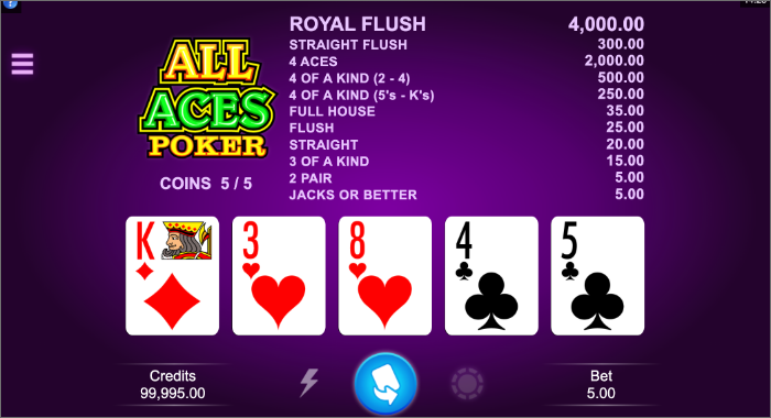 「ALL ACES POKER」は、ビデオポーカーです。配られるトランプの中から役を揃えると報酬がもらえます。