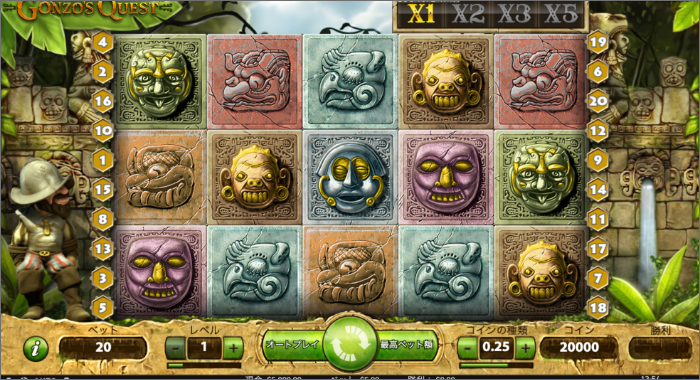ジャングルでの遺跡探検をテーマにした人気ゲームです。落ちゲータイプとなっていて連鎖するとマルチプライヤーが増加していきます。