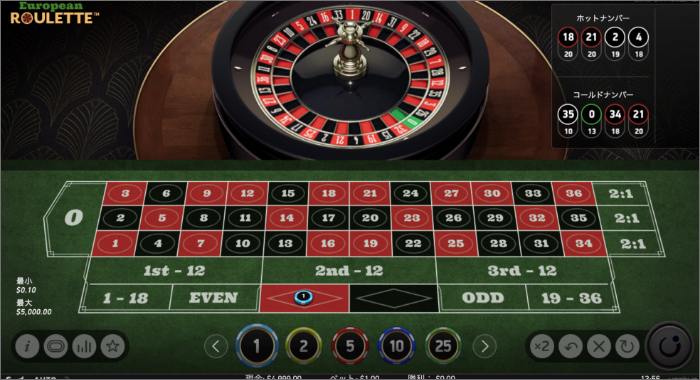 ゼロ(0)が1つだけのオーソドックスな「European Roulette」。ベットリミットが幅広く、統計情報やお気に入りベットなど機能満載です。