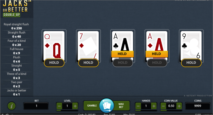 「J」以上(Q・K・A)のペアが出ると配当が成立するビデオポーカーで、初心者からハイローラーまで楽しめます。