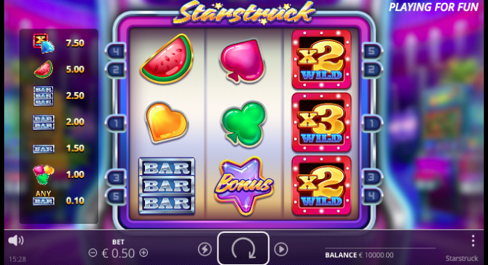 「Starstruck」は3×3リールのシンプルなクラシックスロットで、第2リールの中央に星型のシンボルが停止するとボーナスゲームが始まります。