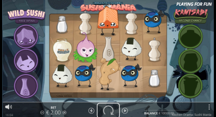 「Kitchen Drama Sushi Mania」は寿司をテーマとしたスロットで、寿司ネタや調味料を模したキャラクターがシンボルに描かれていて、世界観に合わせてポップなイラストとSEが採用されています。