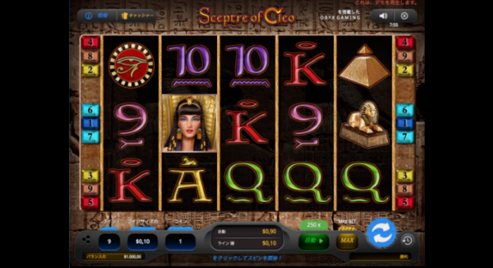 第1位はクレオパトラを題材とした「Sceptre of Cleo」というゲームで、スフィンクスやピラミッドなどが図柄として描かれているのが特徴です。