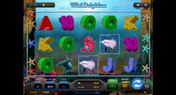 「Wild Dolphins」はイルカとその他の海の生物がテーマとなっているゲームで、1位の「Sceptre of Cleo」と同じく、イルカのスキャッターが3つ以上揃うと2倍のマルチプライヤーが付いたフリースピンへ突入です。