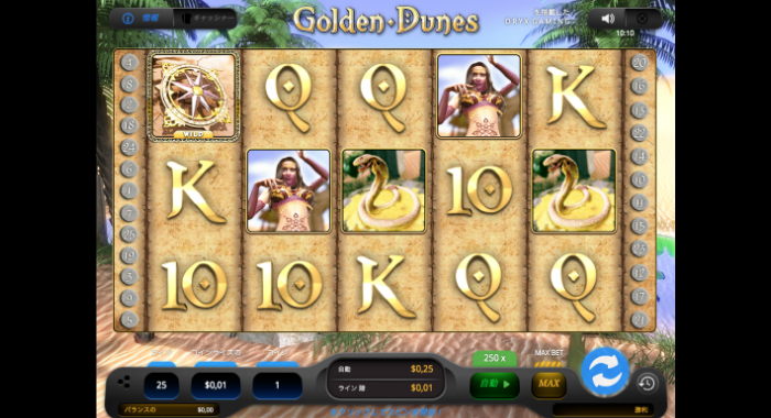 「Golden Dunes」はサソリやコブラ、コンパスなど砂漠に関係するものになっていて、宝箱のスキャッターが揃うとフリースピン突入、オアシスの長が出るとボーナスゲームが始まります。