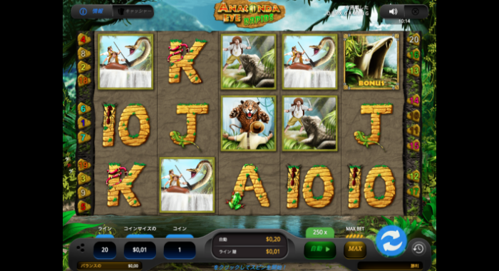 「Anaconda Eye Rapids」はアナコンダがテーマになっていて、ボーナスゲームとフリースピンがあります。