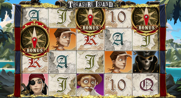 「Treasure Island」は海賊をモチーフにしたゲームです。フリースピンの前には直接勝利金を得たり、フリースピンの回数を増やせるボーナスゲームがあります。