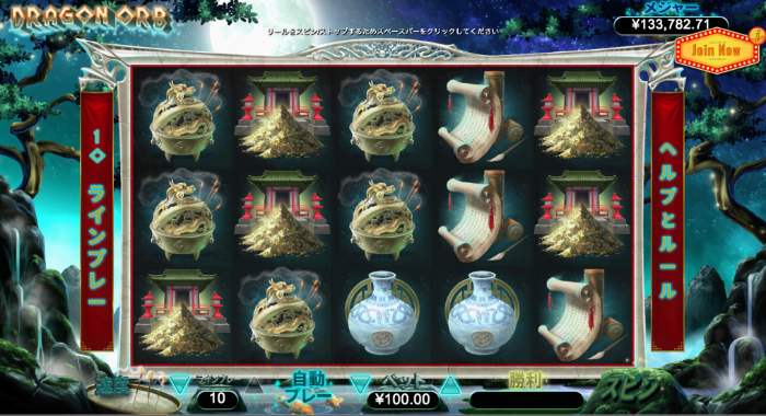 「Dragon Orb」はタイトルの通り竜のオーブが重要な鍵となっていて、オーブの図柄が出現すると縦1リールに拡大し、ホールドした状態でリスピンが発生するのが特徴です。