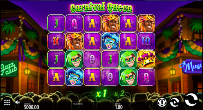 カーニバルがテーマの落ちゲースロットです。フリースピンでワイルドが出現すると、上下左右の一直線上のシンボルを消滅させます。