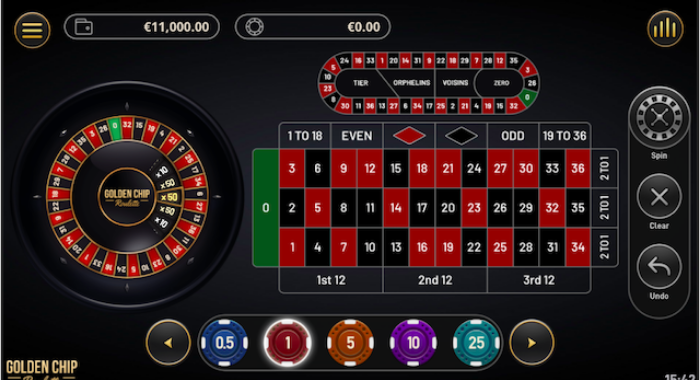 テーブルゲームのルーレットです。還元率は97.3%で、ゴールデンチップ機能により最大500倍まで獲得できます。