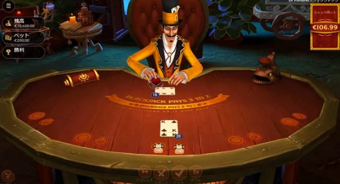「Dr Fortuno Blackjack」は、アバターディーラーであるサーカス団長「Dr Fortuno」とブラックジャック勝負するテーブルゲームです。