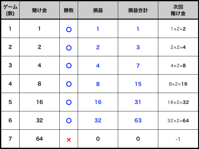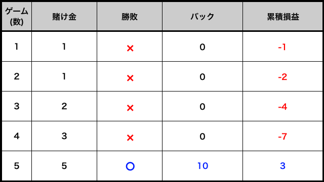 5ゲーム目に勝利したとすると、32ドル配当をもらえるので、これまでの合計賭け金31ドル(1+2+4+8+16)を回収できる計算です。