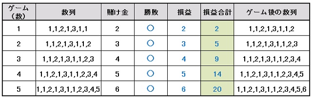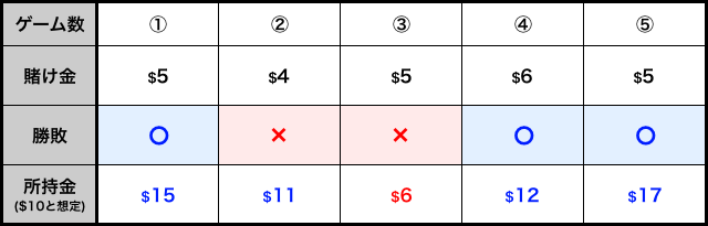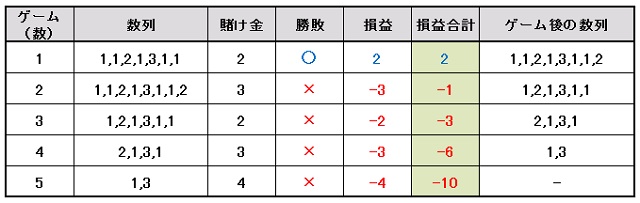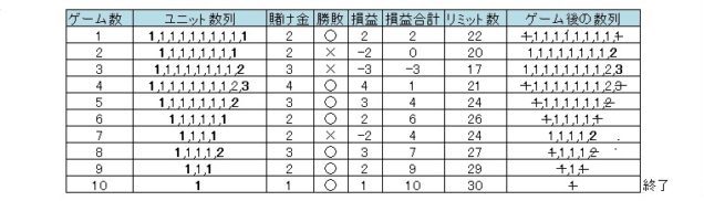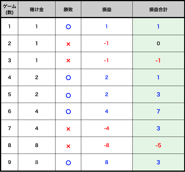| ゲーム数 | 賭け金 | 勝敗 | 総収支 |