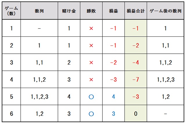 ここでの次賭け金は1+2=3ドルとなります。
