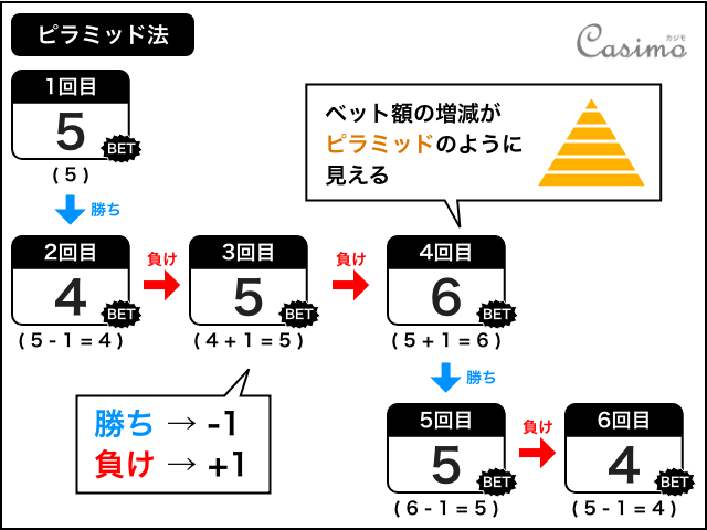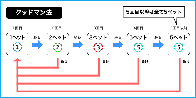 | メリット | ・負けるほど勝利金が大きい ・賭け金の増え方が緩やか |