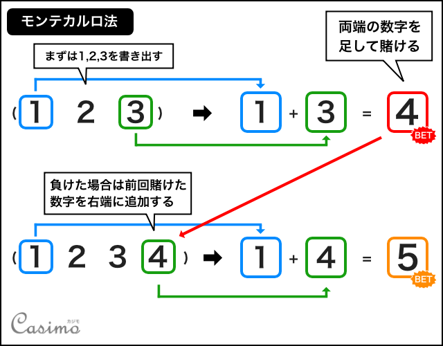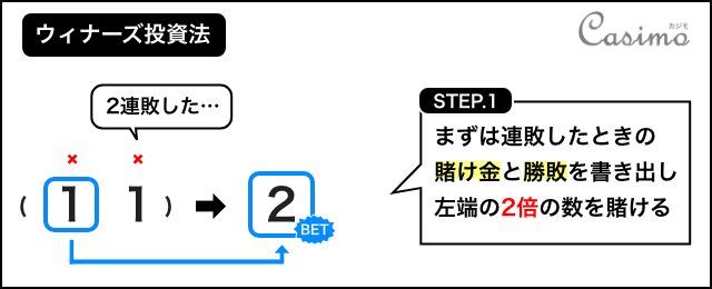 連敗した際の賭け金を数列と考え、その左端の数を2倍します。2倍して作った数が次ゲームの賭け金となります。(1ドル×2ドル = 2ドル)