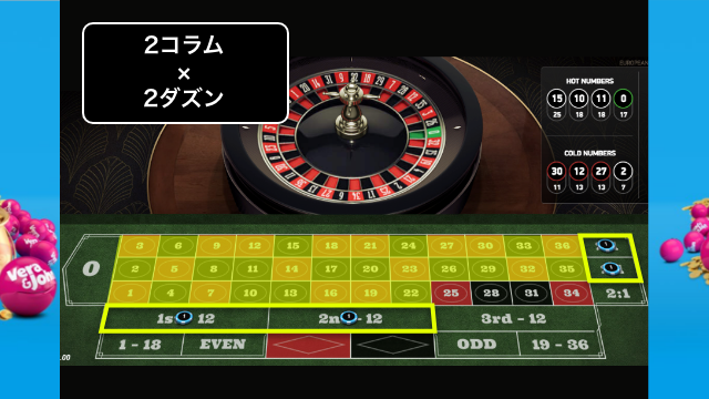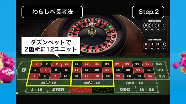 ダズンベットのうち、2箇所に12ユニット賭けます。