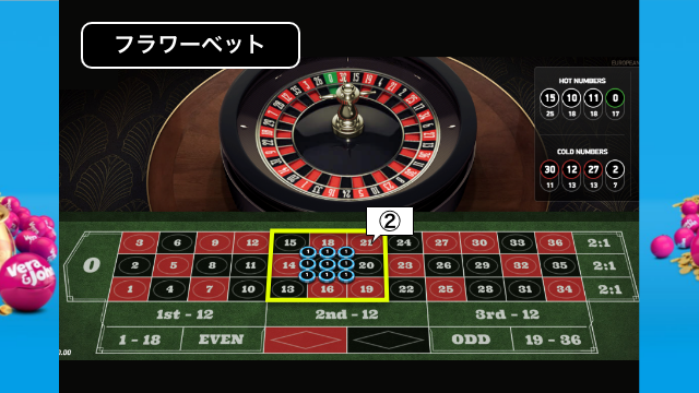 フラワーベット法は、コーナーベット・スプリットベット・ストレートアップを組み合わせた必勝法です。最大144倍の配当をもらうことができます。