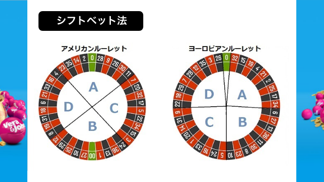 シフトベット法とは、ルーレットの円盤を意識した攻略法になります。円盤を4等分して、そのエリアの数字全てにストレートベットを行います。