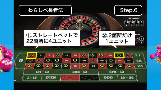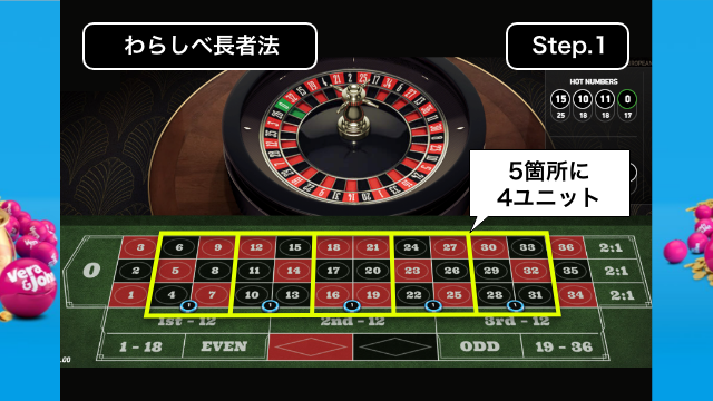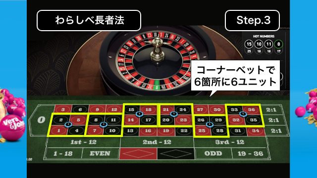 6箇所のコーナーベットに6ユニットずつ賭けます。
