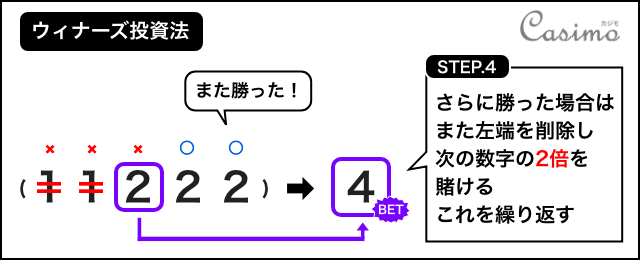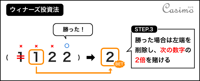 ここで勝った場合、左端の数を消して次の数を基準とします。基準の数を2倍して作った数が次の賭け金となります。(1ドル×2ドル = 2ドル)