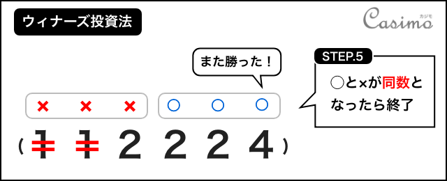 さらに勝ち、○と×の数が同数となりました。これで1サイクル終了です。次に必勝法を開始するときは2連敗するまで待ちます。
