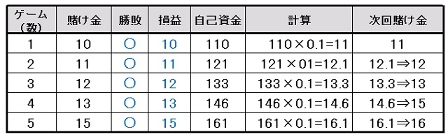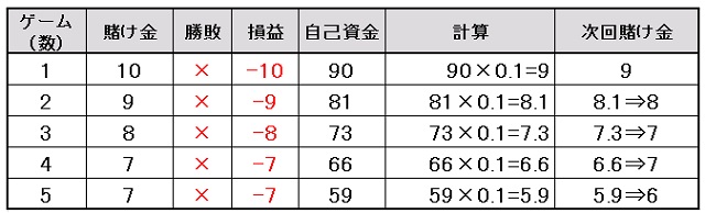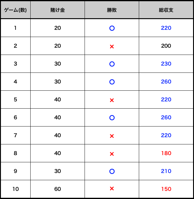 | ゲーム数 | 賭け金 | 勝敗 | 総収支 |