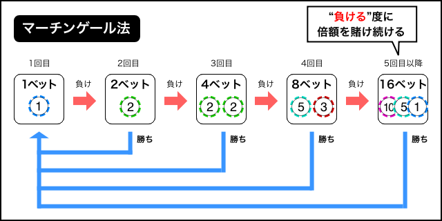 マーチンゲール法は、負けたら前回の賭け金を倍額にするというものです。1回でも勝つことができれば、今まで負けていた損失額を取り戻すことができます。連敗すれば賭け金がどんどん増えていくので、限界がある必勝法です。