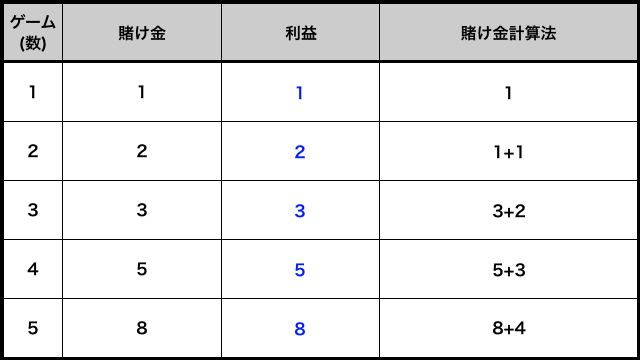 | メリット | ・勝ち負けが五分五分でも利益が出る ・1サイクル終了後必ず利益が出る ・賭け金が急激に増えることはない |