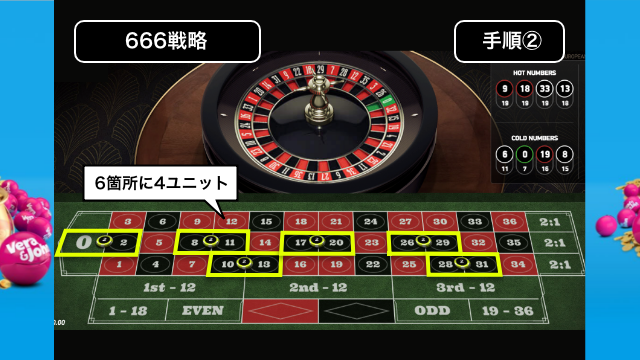 スプリットベットで黒の数字が並んでいる計6カ所に4ユニットずつ賭ける。