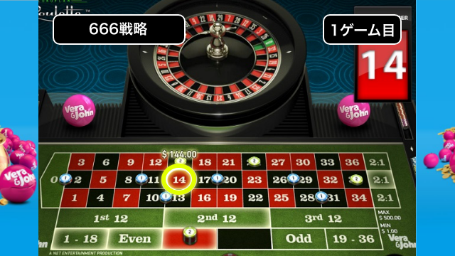 結果:赤の14 赤黒賭けヒット! 損益:12ドル 合計:12ドル ベット範囲広いから余裕ですね