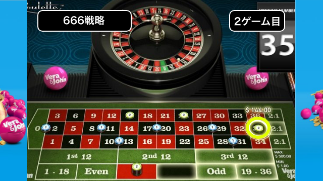結果:黒の35 ストレートアップヒット! 損益:12ドル 合計:24ドル 楽々連勝!勝率89%は伊達じゃないですね
