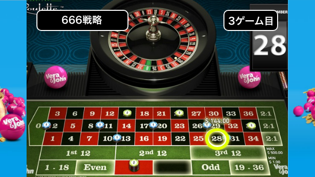 結果:黒の28 スプリットベットヒット! 損益:12ドル 合計:36ドル 3連勝!ベット箇所変えてないから楽ちん。