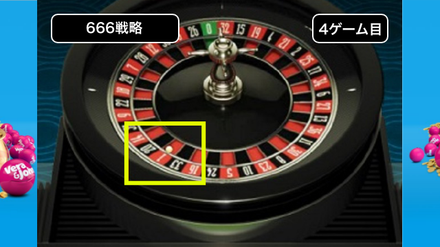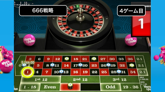 結果:赤の1 赤黒賭けヒット! 損益:12ドル 合計:48ドル 4連勝です。