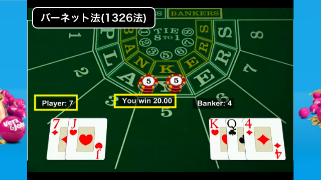 バーネット法は勝率1/2のカジノゲームで使用することができるので、バカラで配当2倍のPLAYERに賭け続けてみます。