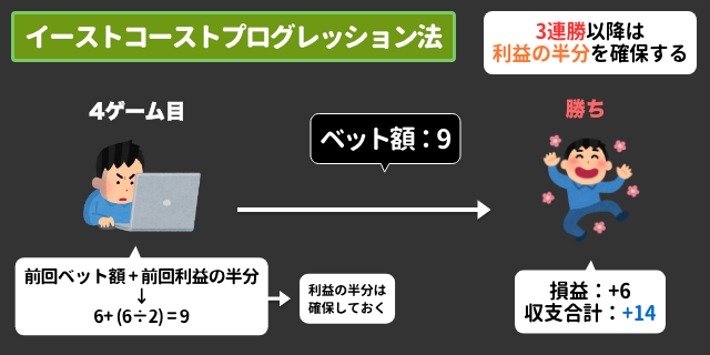 3ゲーム目で勝利した場合、4ゲーム目以降は前ゲームのベット額+利益の半分をベットしてゲームを開始します。