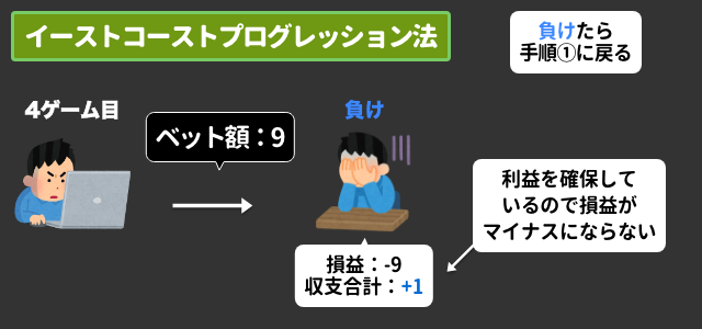 4ゲーム目以降、勝ったときは手順②を繰り返しますが、負けたときは必勝法をストップして手順①に戻ります。