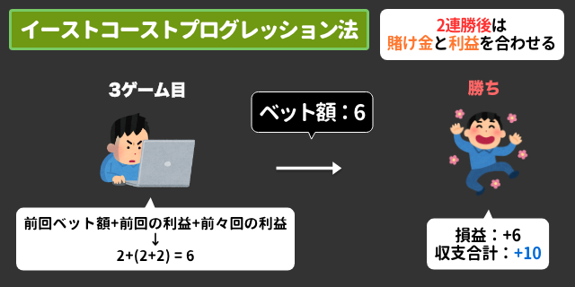 2連勝をした後の3ゲーム目は、初回ベット額+前ゲームの利益+前々ゲームの利益を3ゲーム目のベット額とします。