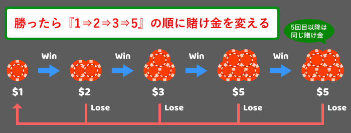 スタート時のベット額を1単位とした場合、1単位、2単位、3単位、5単位と賭け金を変え、負けたら最初のベット額に戻し、4連勝以降は5単位からベット額を固定して賭けます。