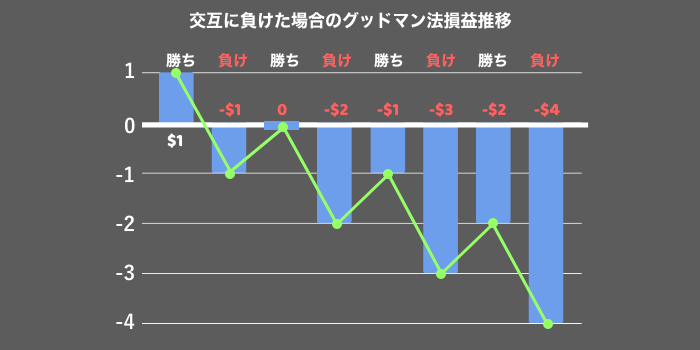 これはグッドマン法が2ゲーム目で1ゲーム目の倍額賭けなければけないためで、勝ち負け交互だとその倍額ベットしたときに負けるからです。